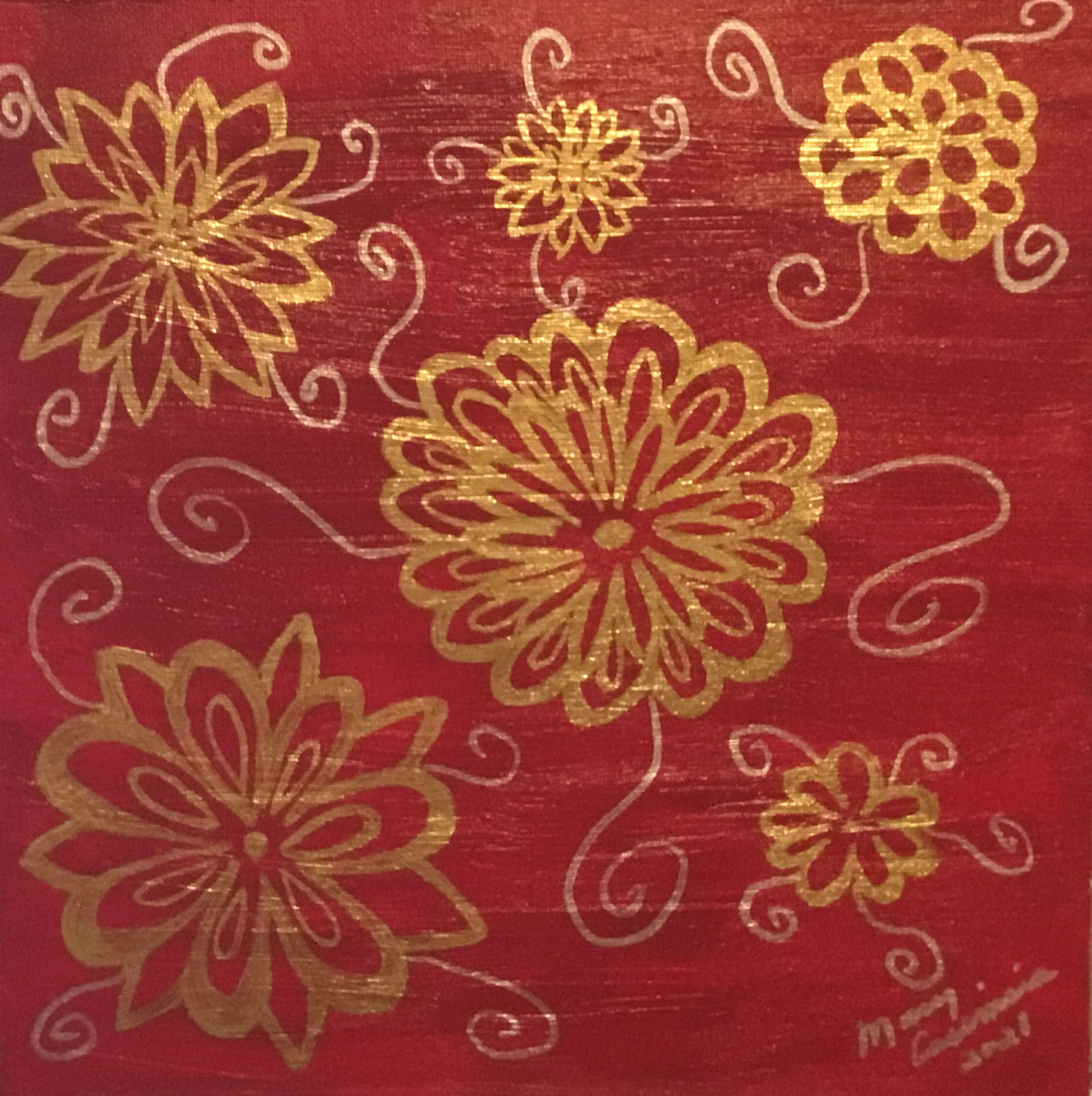 Shimmering golden petals swirl on a ruby red backdrop, evoking elegance and holiday warmth with delicate silver accents.