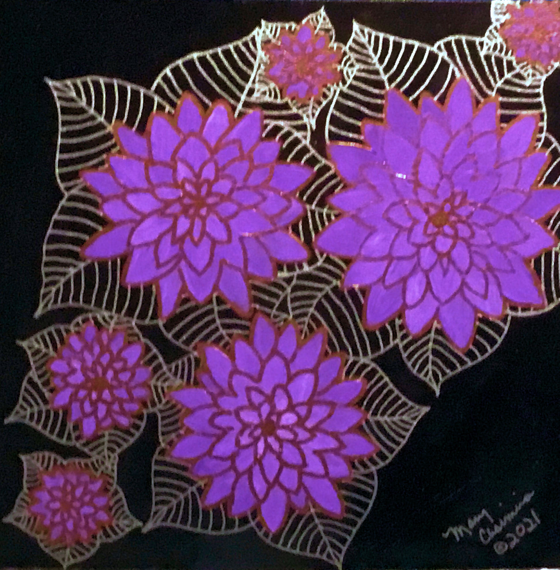 Radiant magenta blossoms leap from a deep black canvas, surrounded by fine gold-veined foliage in this dramatic floral composition.