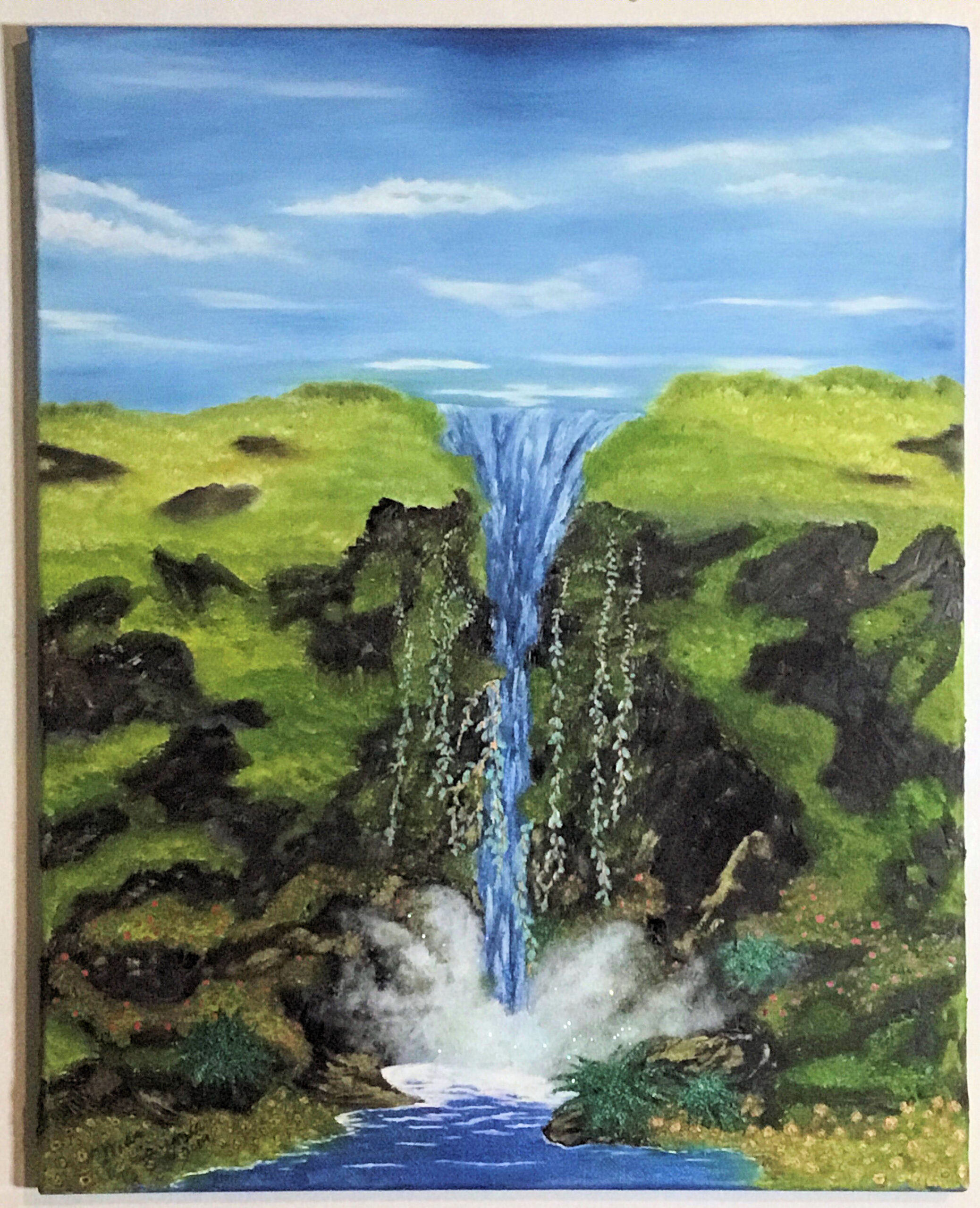 ‘Mystic Falls’ depicts a cascading waterfall tumbling from lush green cliffs into a tranquil pool below. With trailing vines and flowering meadows, this piece is a celebration of renewal and flowing energy.