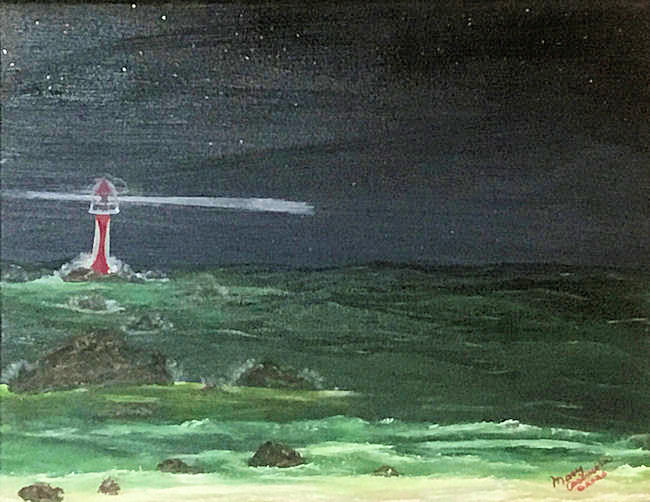 Beneath a starry sky, the weathered red tower of a classic lighthouse casts its beam across dark emerald seas. ‘Old Red’ evokes nostalgia and safety with timeless charm, perfect for nautical-themed interiors.