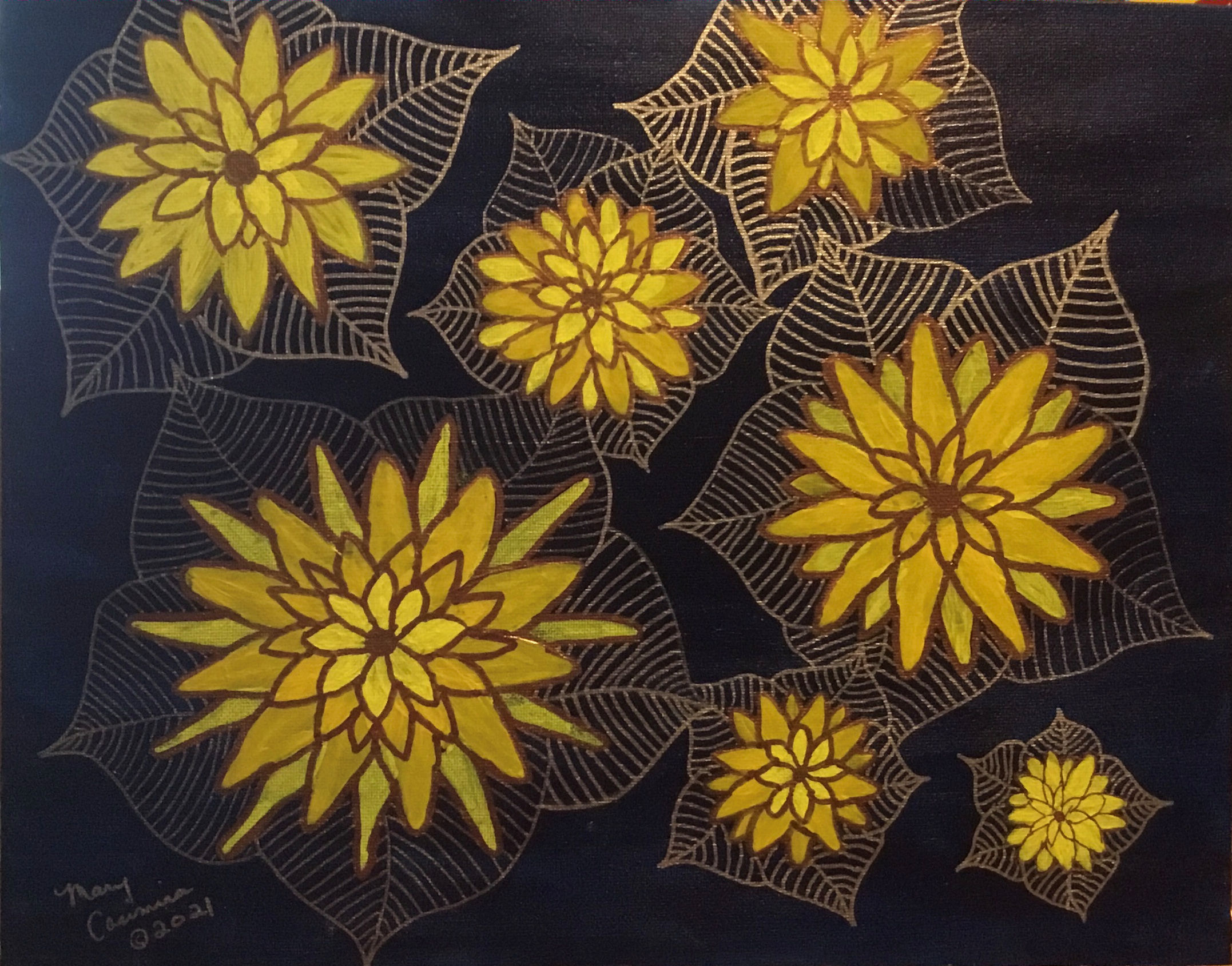 Luminous yellow petals bloom on a midnight-black canvas, evoking twilight serenity and vivid contrast.