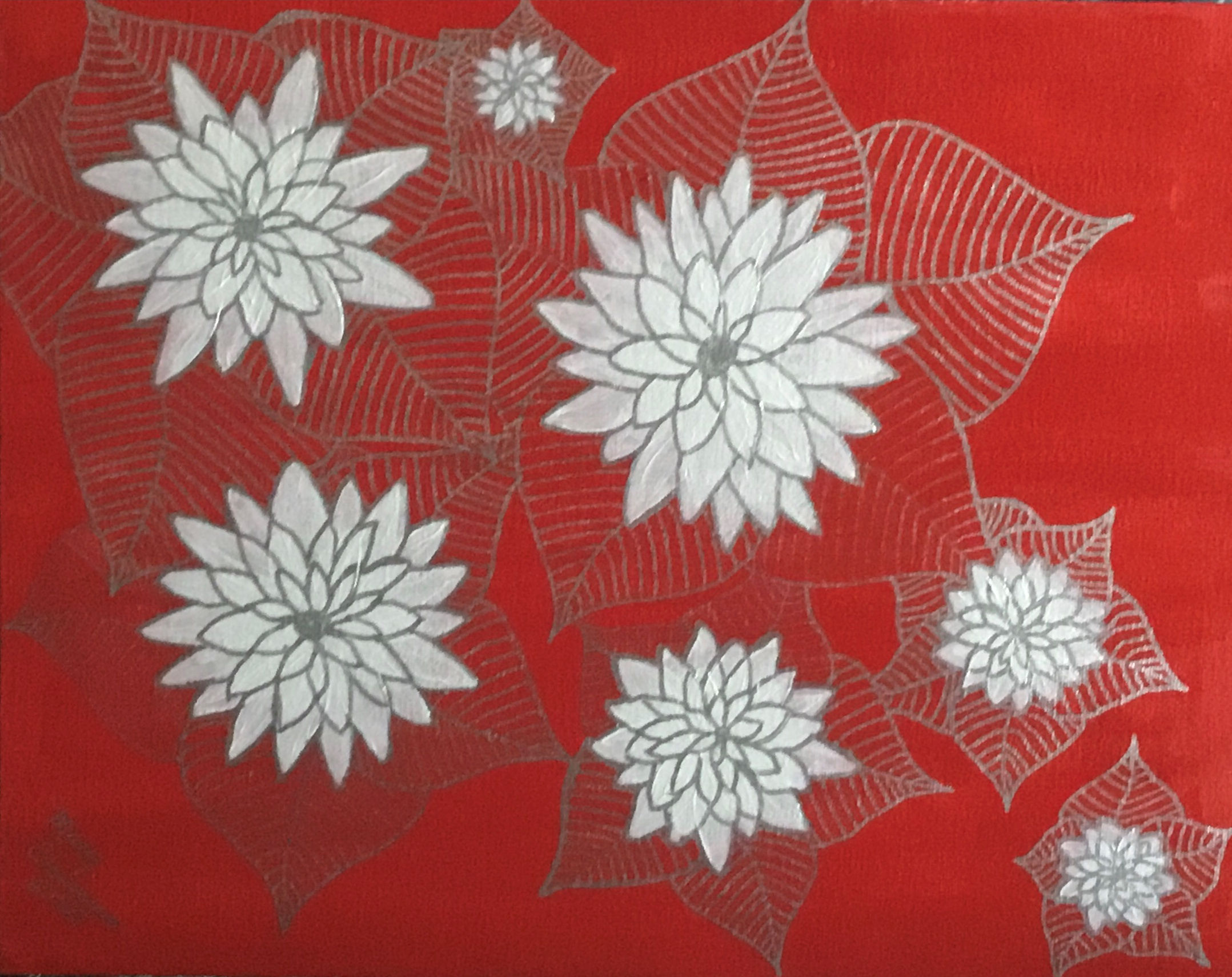 Silvery white flowers bloom gracefully against a rich red canvas, softened by intricate green leaf veining that adds depth and dimension.