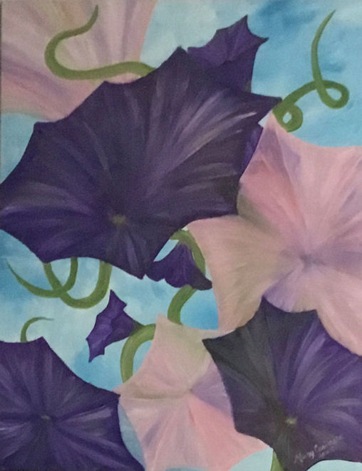 Flowing purple and pink morning glories spiral into a sky-blue dream, evoking serene morning calm.
